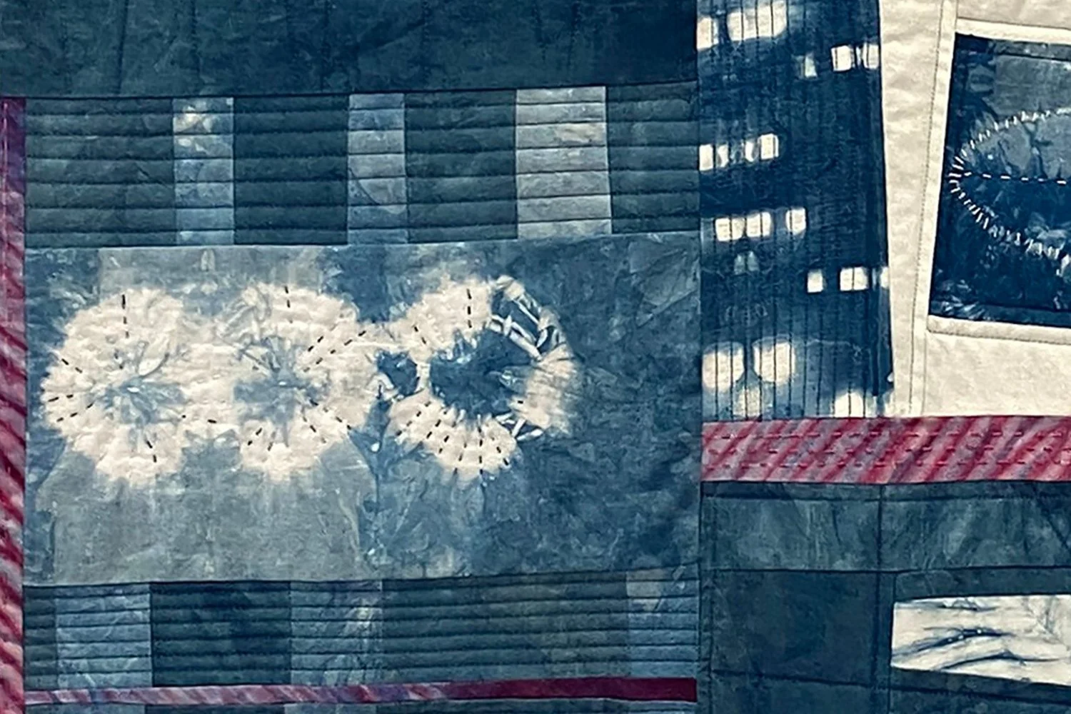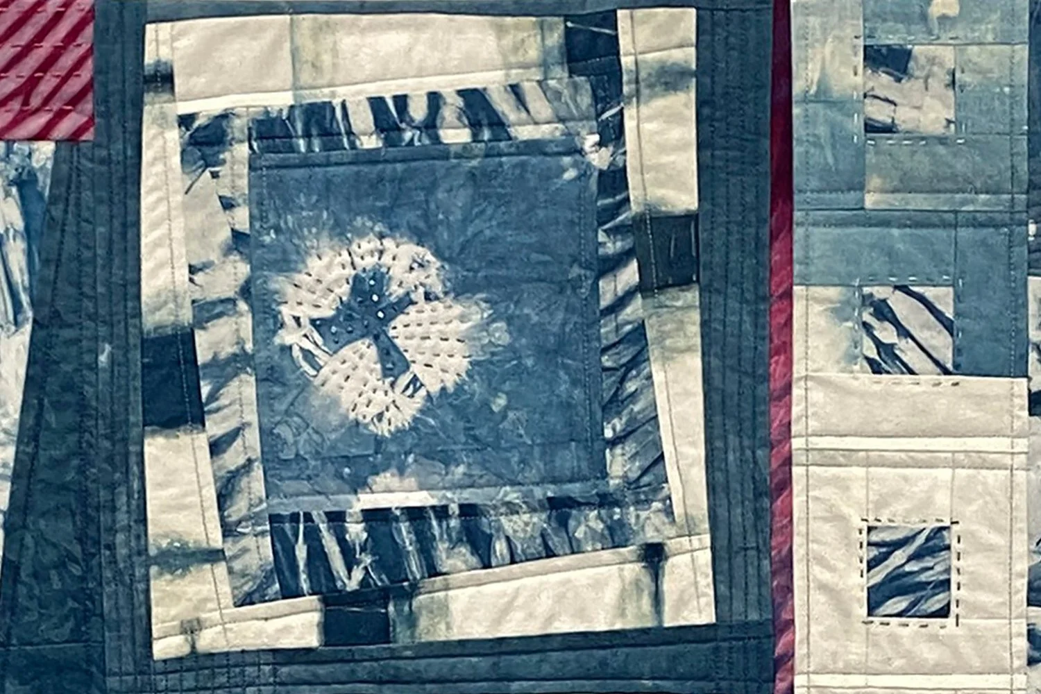 A variety of shibori techniques were used with indigo dye to create the fabrics that were cut and pieced. Hand stitching was done with perle cotton.