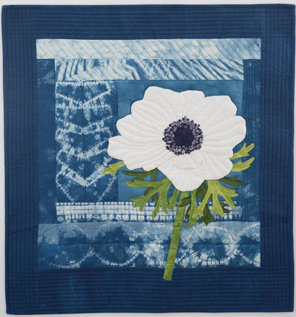 Hand dyed Indigo Shibori Cotton, hand dyed wool, commercial cotton, perle cotton threads, wool batting.