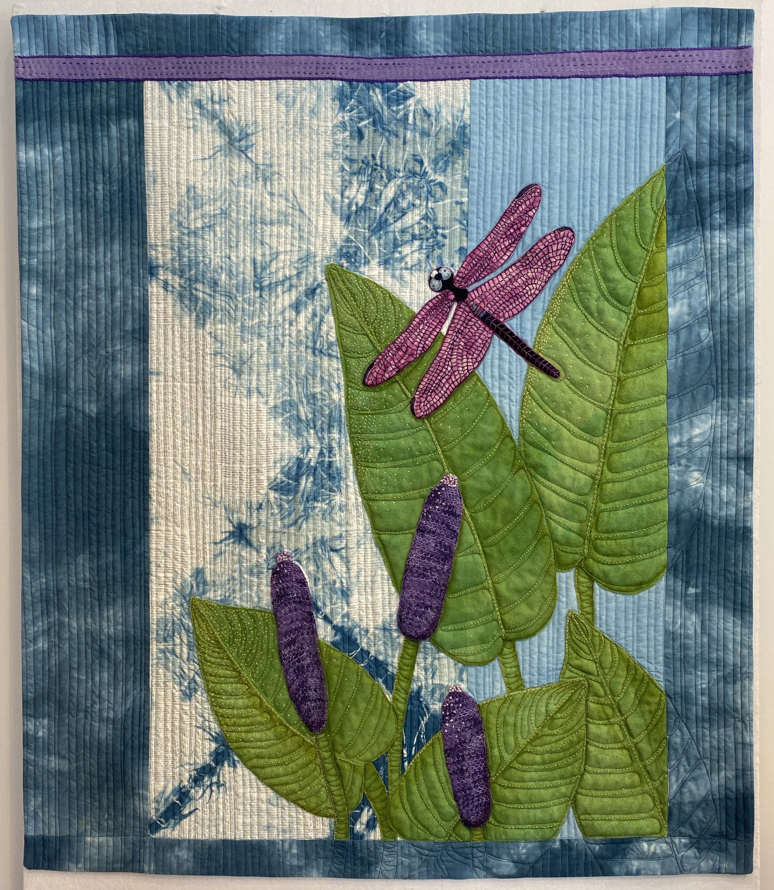 Hand dyed Indigo Shibori Cotton, hand dyed wool, commercial cotton, silk, perle cotton and metallic threads, wool batting.