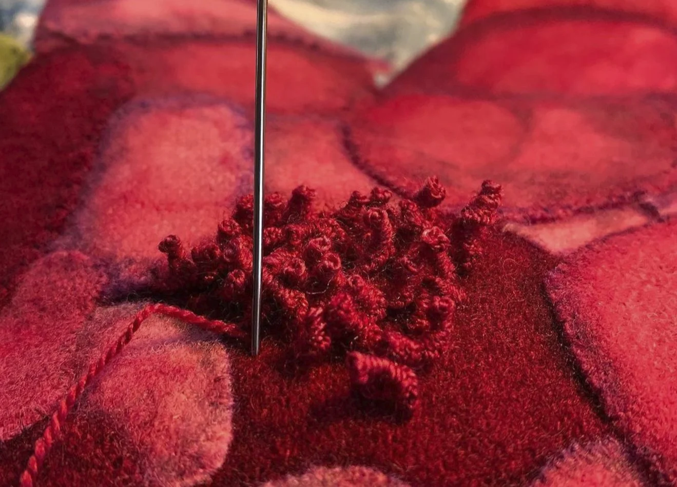 Indigo shibori background with wool appliqué and embroidery before hand and machine quilting.